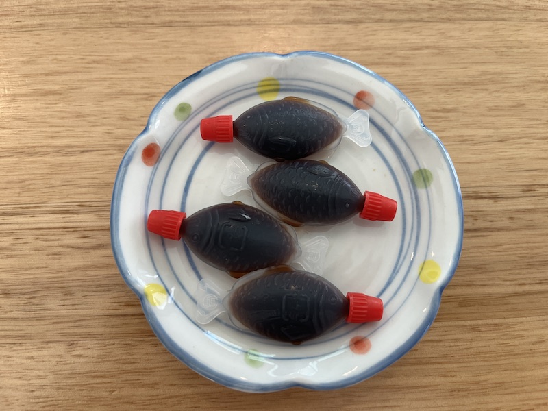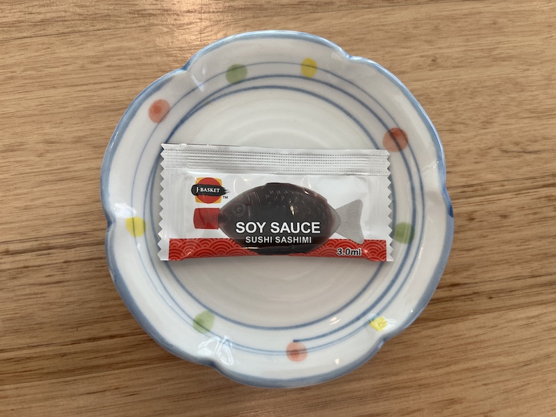 そんなニュースを知っていた私は、先日、とあるお店でお刺身を買った時についていた醤油(写真2)を見て、「やはり、刺身や寿司、のり巻きといえば、あの小さなお魚の形の醤油さしを思い浮かべるなあ。」と思いました。