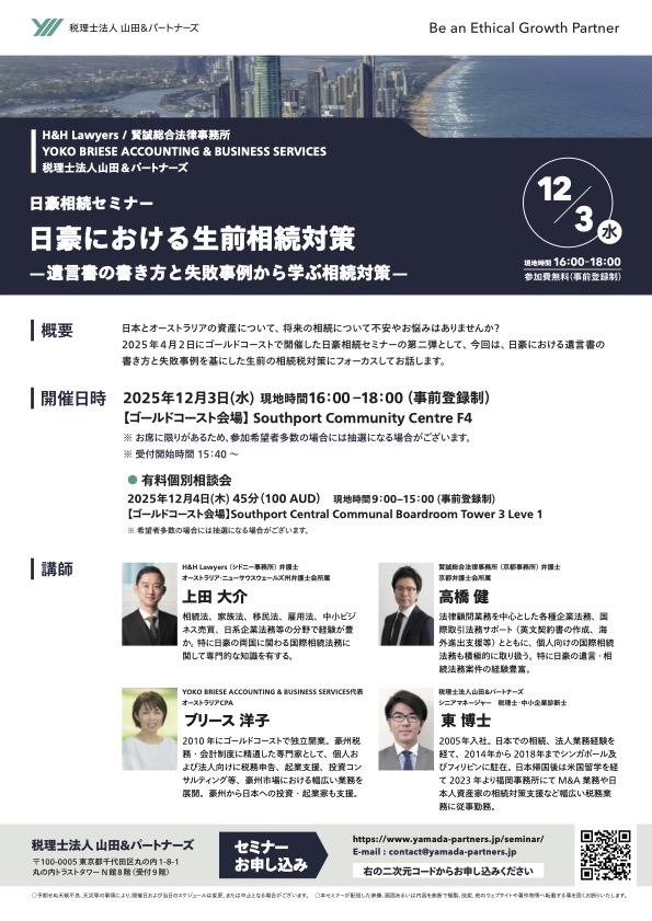 「日豪における生前相続対策」についてのセミナーが来月12月3日(水)にゴールドコーストで開催されます。今年4月に開催された日豪相続セミナーの第二弾として、今回は日豪における遺言書の書き方と失敗事例を基にした生前の相続税対策にフォーカスして専門家がわかりやすくお話してくださるそうです。お席に限りがあるようですので、お早目にお申込みを!