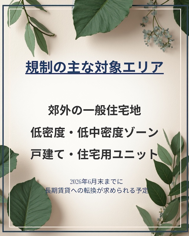 特に問題視されているのが、郊外の住宅地において、本来は「住むための家」である物件が、Airbnbなどの短期宿泊(民泊)として利用されているケースです。こうした状況により、賃貸市場に出回る住宅が減り、さらに騒音やゴミなどの近隣トラブルが発生する例も増えてきました。