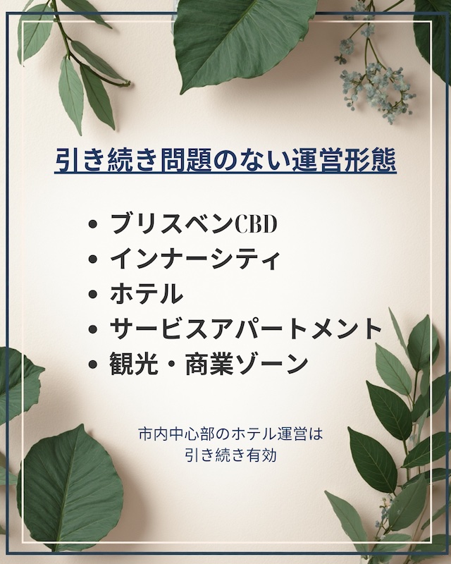 今後のブリスベン不動産投資では、郊外での民泊一本の運営は慎重な判断が必要になる一方、都市部や観光エリアを中心とした宿泊・ホテル型投資は、引き続き有効な選択肢と言えるでしょう。