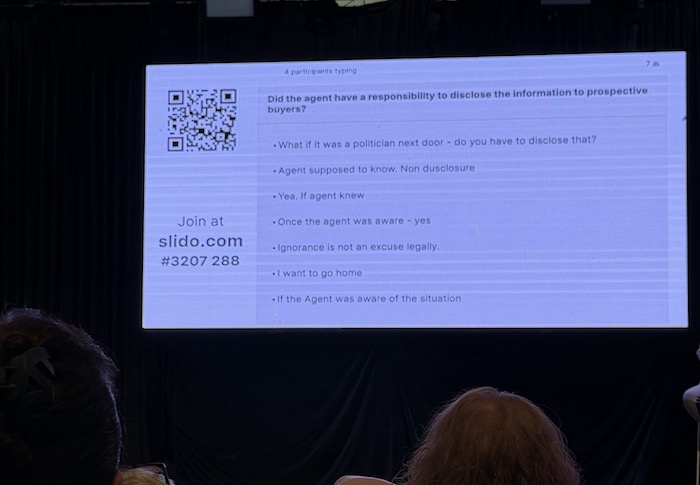 午後のセッションは比較的落ち着いた環境で行われました。質疑応答の時間はとってありますが、今時のITを使ってその場でチャット形式で質問が出来るシステムも導入されていました。もちろん、自分自身がどこの誰であるかを登録してからチャットに参加するのですが、そこはオーストラリアのゴールドコーストと言う感じで、スクリーンに挙がってくる質問 Did the agent have a responsilitily to disclose the information to prospective buyer? What if it was politician next door-do you have to disclose that? (エージェントはその情報を購入者に開示する責任があったのでしょうか?隣の人が政治家の場合、それを買い手に知らせる義務はあるか?)に対して、皆それぞれに回答していますが、中には I want to go home (家に帰りたい)という回答を書く人もいたりしてビックリです。もちろん会場はそれをみて笑いに包まれて、レクチャーする人も私もですよと言っていました。