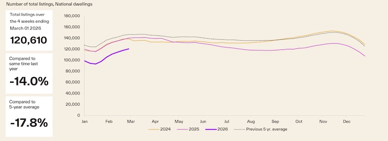 Listings)は、前年同期比で14.0%も低く、過去5年間の平均と比較しても17.8%という大幅な減少となっています。特に供給がタイトな都市では深刻で、パース(-34.3%)やダーウィン(-35.5%)では、広告掲載物件が前年の3分の2程度まで激減しています。※先のブログを見ると両都市において価格が上がっていることが確認できます。
