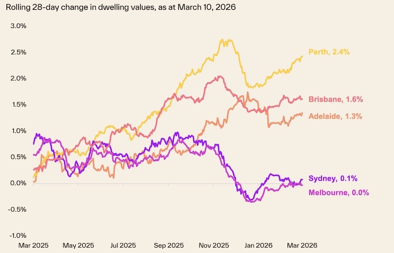 現在、オーストラリアの住宅市場では「二極化(ツースピード)」現象がこれまでにないほど顕著になっています。シドニーやメルボルンといった国内最大規模の都市では、住宅価格の成長に急ブレーキがかかっています。直近3ヶ月の価格変動率を見ると、シドニーはー0.1%、メルボルンはー0.4%と、横ばい、あるいはわずかな下落に転じているのが現状です。特にシドニーの dwelling values(住宅価値)は、2025年11月の記録的な高値からー0.1%低い水準となり、メルボルンにいたっては2022年3月のピークからー1.0%低い状態にあります。